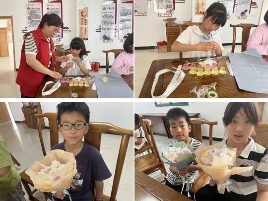 在最后的“DIY制作果凍花束”環(huán)節(jié)中,志愿者一邊講解果凍花束的制作步驟以及注意事項(xiàng),一邊為大家示范制作過(guò)程。孩子們積極配合,準(zhǔn)備好材料,將5個(gè)水粉色的果凍擺放在玻璃紙中間,用透明膠纏繞一圈,巧妙的固定果凍的位置。大家互相合作,探討學(xué)習(xí),給所有的果凍穿上漂亮的“外衣”?;顒?dòng)結(jié)束后,孩子們捧著自己親手制作的果凍花束,每個(gè)人臉上都洋溢著自豪燦爛的笑容。