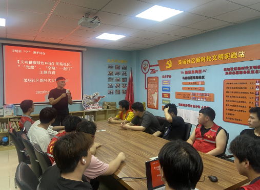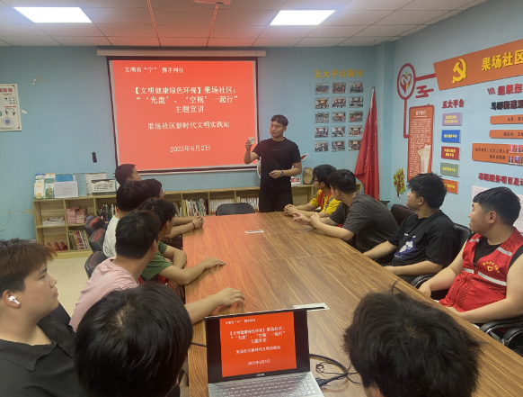 2023年6月2日,果場社區(qū)依托新時代文明實(shí)踐站,組織社區(qū)“齊益果”積分制志愿者、新業(yè)態(tài)新就業(yè)群體、青年居民們在社區(qū)一樓文明實(shí)踐文化陣地開展了“文明有‘寧’ 攜手同行”主題宣講,宣講標(biāo)題為:“光盤、空瓶”一起行。