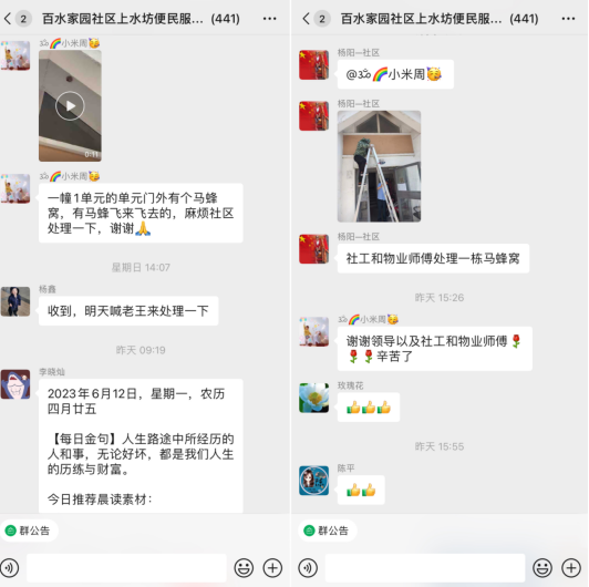 近期,南京市棲霞區(qū)馬群街道百水家園社區(qū)居民發(fā)現(xiàn)單元門口有個馬蜂窩,比拳頭大一些,有很多馬蜂飛來飛去,看著讓人心驚。便通過掌上云社區(qū)微信群反映這一情況,希望社區(qū)和物業(yè)幫忙想想辦法。