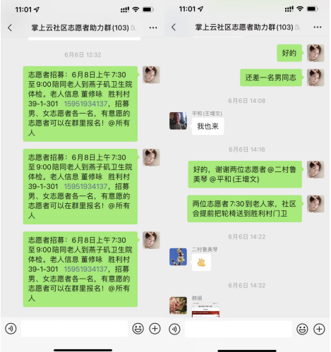 “我和老伴歲數(shù)大了,腿腳不利索,兒女也不在身邊,希望找個(gè)人陪我去體檢,上下樓檢查什么的也方便點(diǎn)。”家住勝利村39幢的老人董師傅在社區(qū)掌上云微信群求助,因行動(dòng)不便,希望有人陪同去參加6月8日的老年人體檢,掌上云社區(qū)群主立即在掌上云志愿者群里發(fā)起志愿者招募,群里的熱心黨員志愿者王增文和魯美琴二人立即在掌上云微信群內(nèi)給予回應(yīng),表示愿意陪同老人去體檢。
