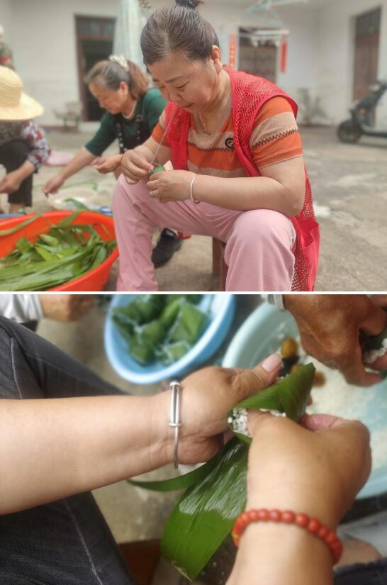 隨后,大家一起動手準(zhǔn)備糯米、粽葉、蜜棗等材料,將粽葉填滿糯米、夾入蜜棗,然后用粽繩系好,大家一邊包著粽子,一邊懷念以前的勞作時光,感慨現(xiàn)在的幸福生活。在王奶奶和周奶奶的引領(lǐng)下,大家一起唱起當(dāng)年集體勞動時的插秧歌,熱情高漲。不一會兒,一個個結(jié)實飽滿的粽子就擺滿了臉盆。活動現(xiàn)場氣氛歡快,笑聲不斷。