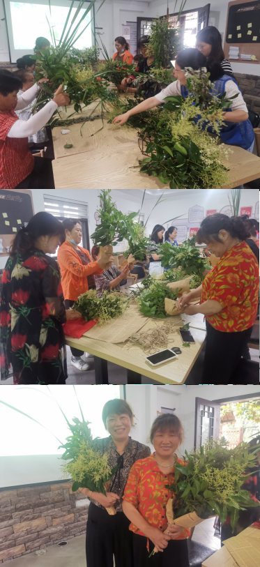 每逢端午時(shí)節(jié),家家戶(hù)戶(hù)都會(huì)把艾草插在門(mén)口,祈求平安,辟邪祛病。隨后,大家開(kāi)始了動(dòng)手實(shí)踐,艾草、菖蒲葉、桃樹(shù)枝、香樟果......在志愿者的指導(dǎo)下,大家熱情高漲,運(yùn)用豐富的花材認(rèn)真設(shè)計(jì)裝扮節(jié)日的花束。在一雙雙靈巧的雙手下,一件件芬芳美麗的端午花束作品誕生了,美好、向上的力量在這次活動(dòng)中得到了充分的體現(xiàn)。