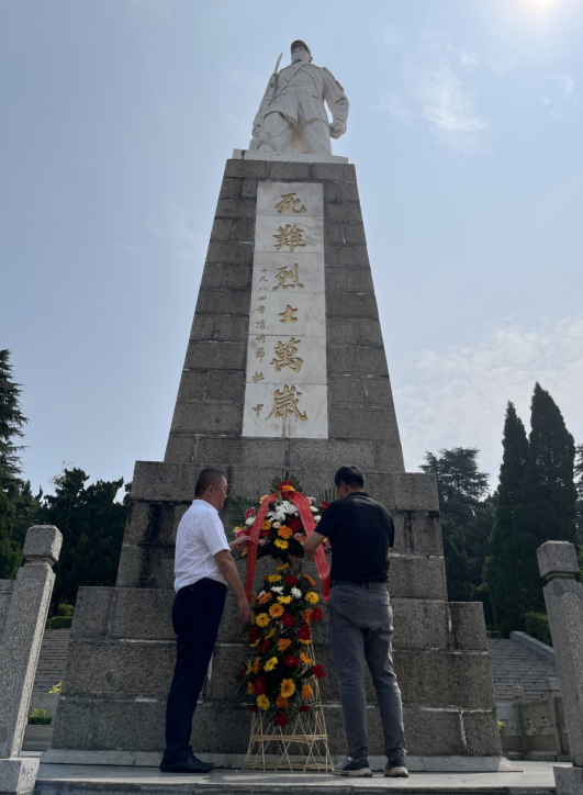 隨后各位黨員踏上前往烈士紀(jì)念碑的臺(tái)階,在紀(jì)念碑前敬獻(xiàn)花圈,由社區(qū)黨委書記譚勇、社區(qū)黨委副書記馬志強(qiáng)為其整理挽聯(lián),各位黨員面對(duì)威嚴(yán)屹立的英雄墓碑,大家肅穆而立,默哀致敬,表達(dá)對(duì)革命先烈的崇敬之情。