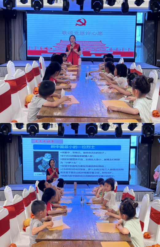 活動(dòng)現(xiàn)場,志愿者老師通過ppt為孩子們展示黨旗、黨徽,介紹了圖案的意義。隨后,用通俗易懂的語言、生動(dòng)形象地講述了革命前輩們不怕犧牲、英勇奮戰(zhàn)的黨史、新中國最小的一位烈士宋振中的故事,帶領(lǐng)孩子們深入了解了中國共產(chǎn)黨從誕生到不斷發(fā)展壯大的光輝歷程。讓孩子們對(duì)革命烈士的敬仰之情愈加濃烈,對(duì)如今幸福生活的來之不易更是充滿感恩。孩子們津津有味聽著歷史故事,并積極提出自己不懂之處,老師們耐心一一解答。
