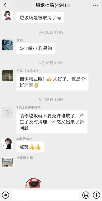 投票內(nèi)容制作完畢后,群主即通過小棲在掌上云社區(qū)群內(nèi)進(jìn)行推送,群友們積極參與投票,表達(dá)自己對(duì)此事的看法。經(jīng)過一周的投票,約有500多位居民參與了投票,支持拆除建筑垃圾池的居民占比超過90%。在投票征詢結(jié)果已出的情況下,蛇盤社區(qū)與轄區(qū)物業(yè)再次進(jìn)行協(xié)商,確定了拆除時(shí)間,及建筑垃圾池拆除后小區(qū)內(nèi)新產(chǎn)生的建筑垃圾臨時(shí)堆放如何處理的問題。在所有問題均安排妥當(dāng)后,小區(qū)物業(yè)安排工作人員將該處建筑垃圾池拆除,拆除后還安排了衛(wèi)生消殺工作。原垃圾池位置變成了3個(gè)地面停車位,解決了幾位居民的停車難題。在垃圾池拆除完畢后,掌上云微信群里一片點(diǎn)贊、叫好聲。