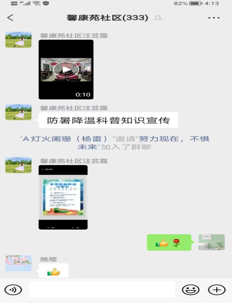 “趁“熱”,這份防暑降溫指南請(qǐng)查收.......”居民群內(nèi),社區(qū)工作人員通過(guò)友情提醒、鏈接推送、圖文科普、視頻宣教、互動(dòng)分享等形式為居民們普及了熱射病相關(guān)知識(shí)以及使用的防暑知識(shí),提醒居民防暑重在預(yù)防,要避免在日照強(qiáng)烈的時(shí)間段劇烈運(yùn)動(dòng);外出要做好防護(hù),盡量走在陰涼處;多喝水補(bǔ)充有機(jī)鹽分;居家空調(diào)溫度不宜太低;家中可常備仁丹、藿香正氣水等防暑藥品;如高溫引發(fā)身體不適,應(yīng)及時(shí)就診治療。“夏季莫貪涼,謹(jǐn)防空調(diào)病”、“我家就經(jīng)常熬些綠豆湯”、“冰鎮(zhèn)食品注意少吃”、“外出可隨身攜帶清涼油、藿香正氣等防暑藥品”、“西紅柿、絲瓜、苦瓜也是不錯(cuò)的選擇”......居民們紛紛分享道。