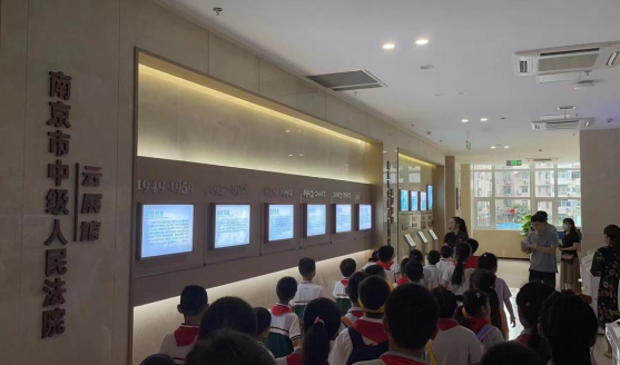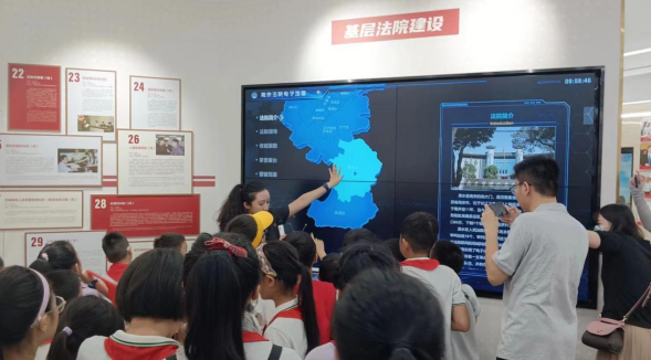 其次,在法院工作者小姐姐的帶領(lǐng)下,大家依次參觀了大廳、云展館、導(dǎo)訴臺和歷史陳列館等。通過對大量的圖片、文字、實物以及多媒體的介紹,工作人員生動形象地展示了法院的歷史沿革、組織架構(gòu)、審判流程等方面的內(nèi)容。同學們都聆聽、觀察得十分仔細,還時而提問交流,并在攝影區(qū)域紛紛拍照留念。