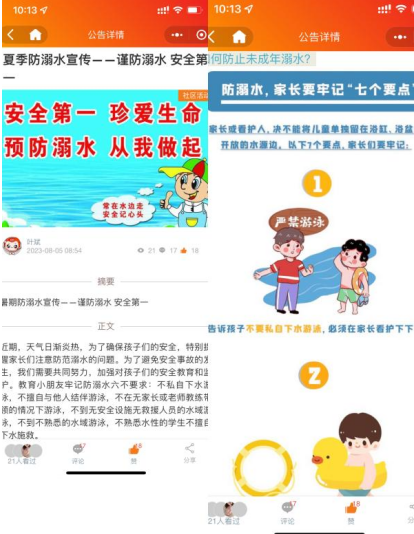 此次利用掌上云社區(qū)平臺(tái)宣傳防溺水安全教育活動(dòng)起到了較好的警示作用,在提高孩子們防溺水的安全意識(shí)的同時(shí),也為孩子們構(gòu)筑了安全防護(hù)。