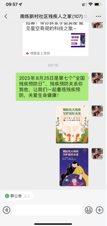 活動前夕,南煉新村社區(qū)殘協(xié)在殘疾人之家微信群大力宣傳殘疾預(yù)防核心知識,同時依托殘疾人之家等社區(qū)居民服務(wù)場所,針對不同群體開展定向宣傳?;顒赢斕?,社區(qū)殘協(xié)的青年志愿者通過深入淺出講解一二級預(yù)防措施,以及因先天、遺傳、意外傷害等致殘的預(yù)防知識,幫助居民認識殘疾預(yù)防的緊迫性,在提升預(yù)防勝于治療、“每個人都是自己健康的第一責(zé)任人”的意識中,講述體育鍛煉、合理膳食、良好心情、健康生活習(xí)慣的重要性。