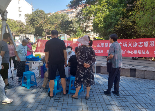 上午7時(shí),共建醫(yī)療單位的醫(yī)護(hù)工作人員早早到達(dá)廣場(chǎng)布置現(xiàn)場(chǎng),社區(qū)“齊益果”積分制志愿者積極參與,義診現(xiàn)場(chǎng)設(shè)置測(cè)血糖,血壓,身高體重,醫(yī)療服務(wù)咨詢臺(tái)等不同類別的服務(wù)區(qū),不多時(shí),轄區(qū)新業(yè)態(tài)群體中外賣員、郵遞員利用短暫休息時(shí)間前來檢測(cè)?;顒?dòng)持續(xù)到上午11時(shí),在時(shí)間上可以滿足大部分小區(qū)居民檢測(cè)需要。