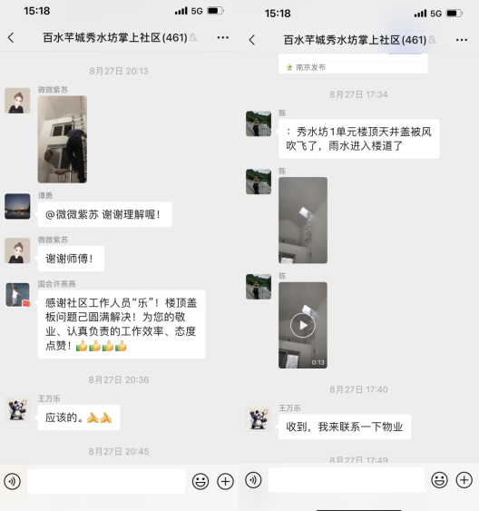 “秀水坊1單元樓頂天井蓋被風(fēng)吹飛了,雨水進(jìn)入樓道了”,8月27日,南京市棲霞區(qū)馬群街道百水芊城社區(qū)的“掌上云”微信群里出現(xiàn)了這樣一條求助信息。
