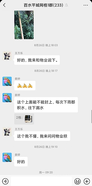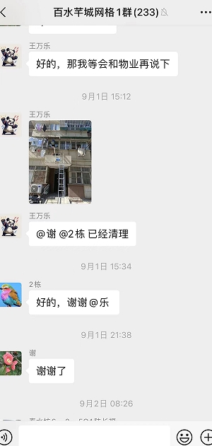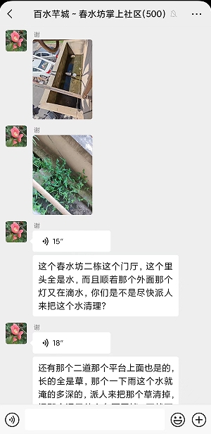 百水芊城社區(qū)網(wǎng)格員在“掌上云”微信群看到訴求后立刻前往現(xiàn)場(chǎng)查看,發(fā)現(xiàn)此處平臺(tái)日常保潔根本無法察覺到,只有住戶自己能看到,現(xiàn)場(chǎng)正如居民所述一致,確實(shí)是一處衛(wèi)生死角。當(dāng)即網(wǎng)格員聯(lián)系物業(yè)師傅帶上梯子和相關(guān)清掃工具,爬上平臺(tái)后把積水疏通,并將、雜草、淤泥、垃圾一同清理干凈,隨后網(wǎng)格員在“掌上云”微信群里告知訴求人,說明該處問題成功順利解決,社區(qū)及時(shí)有效的處理得到居民的一致認(rèn)可。