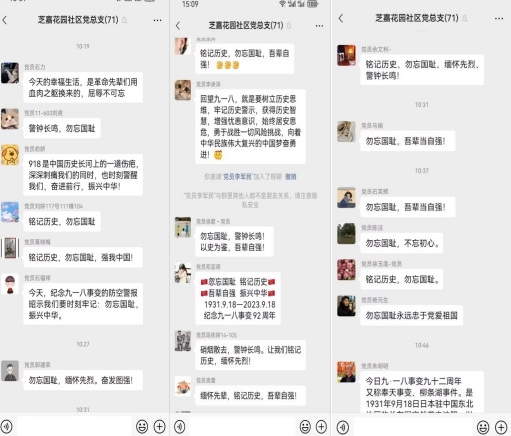 2023年9月18日星期一,當芝嘉花園社區(qū)早上響起防控警報的那一刻,在掌上云的微信群里,大家不約而同的紛紛發(fā)表自身的感悟,提醒讓我們銘記歷史,勿忘國恥,自強不息。繼承先烈遺志,向烈士致敬,是您喚醒了沉睡的中國,是您用鮮血開啟了一個新的紀元,您們是中華民族的驕傲,是中華民族的象征。我們更應當珍惜此刻的生活,為祖國的繁榮昌盛而奮斗!