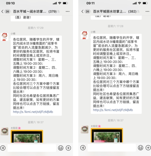 為更好的服務社區(qū)居民,以社區(qū)讀者所盼、所需為導向,有針對性地滿足群眾文化需求,百水芊城社區(qū)運用“掌上云社區(qū)”業(yè)務管理平臺,通過“小棲”機器人向小區(qū)微信群推送百水芊城小區(qū)“閱享書屋”的開放調整協(xié)商管理通知,通過線上協(xié)商留言方式邀請轄區(qū)居民集思廣益,建言獻策,在選擇好的開放方案同時也可以提出其他的方案。
