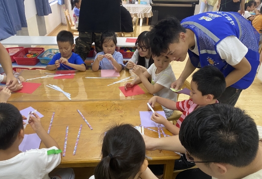 本次活動由果場社區(qū)聯(lián)合工會牽頭,吸納轄區(qū)手工愛好志愿者、大學生志愿者組成志愿力量,與社區(qū)工作人員一起分工合作?;顒诱n程分為手工制作千紙鶴、手工折疊五角星兩種,由轄區(qū)職工子女們按喜好選擇課程內(nèi)容。