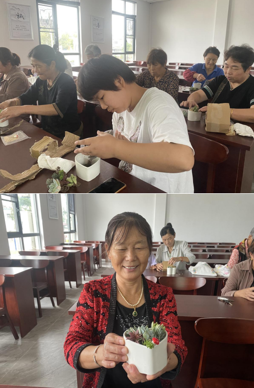 接下來,志愿者們指導大家選擇和搭配植物,并親自幫助他們制作獨特的盆栽。這不僅是一項具有藝術性的手工活動,更是一種放松和享受過程的方式。殘疾村民們在制作盆栽的過程中感受到了和植物的連接,平靜了內心,獲得了一份屬于自己的小小幸福。最后,社區(qū)志愿者與殘疾村民們合影留念,共同記錄下這個美好的時刻。
