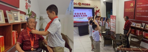 杜爺爺還意味深長地囑托道:“你們生活在幸福的新時代,一定要好好學(xué)習(xí),天天進步,以后為國家做貢獻!”少先隊員們給杜爺爺戴上紅領(lǐng)巾,向杜爺爺敬禮。