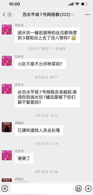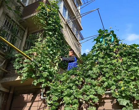 中秋、國(guó)慶雙節(jié)期間,棲霞區(qū)馬群街道百水芊城7號(hào)網(wǎng)格“掌上云”微信群接到一位居民訴求信息,反映一棵絲瓜藤長(zhǎng)勢(shì)兇猛,已經(jīng)爬到了三樓陽(yáng)臺(tái)了,希望居委會(huì)或物業(yè)部門盡快安排人員到現(xiàn)場(chǎng)察看并幫忙清理。