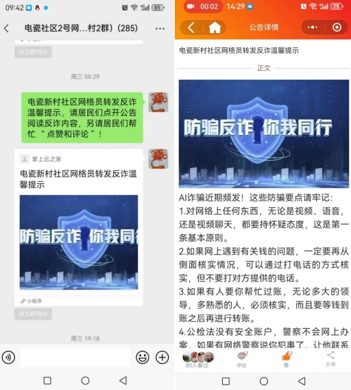 為了更好地傳遞宣傳信息,電瓷新村社區(qū)利用線上掌上云社區(qū)網(wǎng)格群的推廣方式,廣泛宣傳防范電信網(wǎng)絡(luò)詐騙的知識和技巧。通過發(fā)布相關(guān)知識文章、轉(zhuǎn)發(fā)預(yù)防警示信息等方式,社區(qū)居民可以隨時(shí)隨地獲取相關(guān)的防范詐騙的信息。