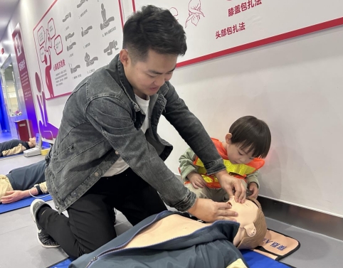 活動現(xiàn)場還進行了模擬應急救護演練。消防員們生動展示了急救流程和必備的急救方法,向孩子們傳授了生命救援的基本知識。孩子們跟著消防員的步驟,有序上手練習。