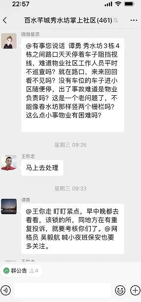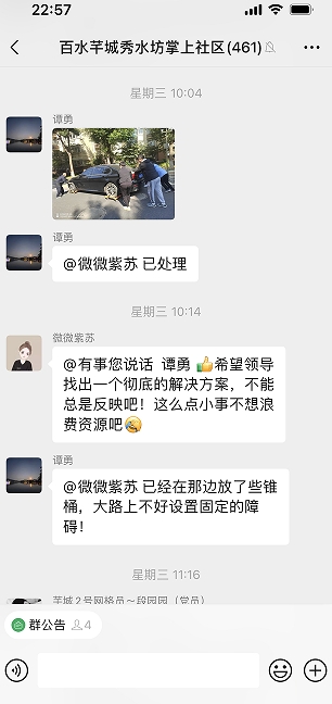 10月18日,百水芊城社區(qū)“掌上云”微信群收到居民訴求信息,有一輛汽車停放在路口,遮擋路口行人及非機(jī)動車視線,希望社區(qū)想辦法解決。