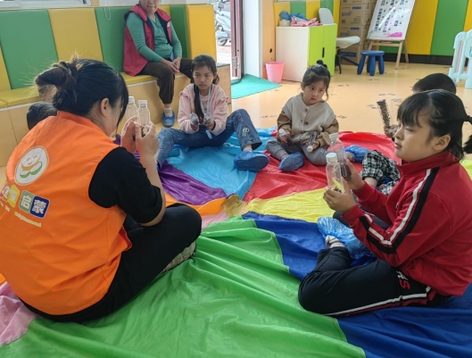 活動現(xiàn)場,孩子與家長們圍坐成半圓,志愿者帶領(lǐng)幼兒們進行自我介紹并相互打招呼。這個環(huán)節(jié)不僅是幼兒們展示自己的機會,也是家長們與其他家庭互相了解的機會。同時,志愿者還帶領(lǐng)幼兒們聽音樂并進行律動,為活動注入了更多的活力和歡笑。