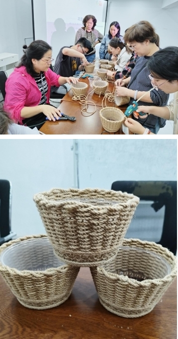 活動現(xiàn)場,社區(qū)工作人員、志愿者向居民們講解苧麻編織花籃的方法、步驟,并進行了示范,居民們認真聽講解、仔細看示范,學習其中要領。在工作人員與志愿者的指導下,大家開始動手制作,大家先用膠槍將麻繩粘在托盤上,再用麻繩一圈一圈地纏繞花桿,居民們互幫互助,團結友愛。一邊編織著花籃一邊嘮家常,回憶過去,居民之間交流與互動,樂趣無窮。