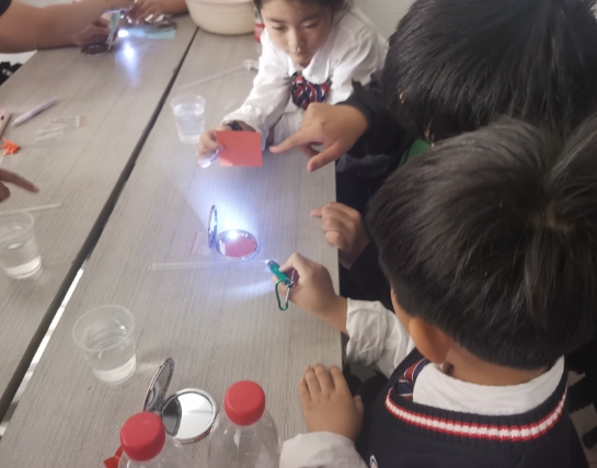 在光學(xué)實驗過程中,志愿者們采取“一對一”教學(xué)方式,讓孩子們能夠更加深入地進(jìn)行物理科學(xué)實驗,加強對物理知識的掌握程度和引導(dǎo)探索的好奇心。孩子們都十分主動動手,跟隨著志愿者的講解,做著一個個實驗,領(lǐng)略著光的神奇。