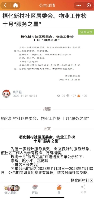 11月27日,棲化新村社區(qū)在“掌上云社區(qū)”內(nèi)開展“服務之星”評比活動。該活動旨在樹立正向榜樣,激勵社區(qū)工作人員為居民提供更優(yōu)質的服務。