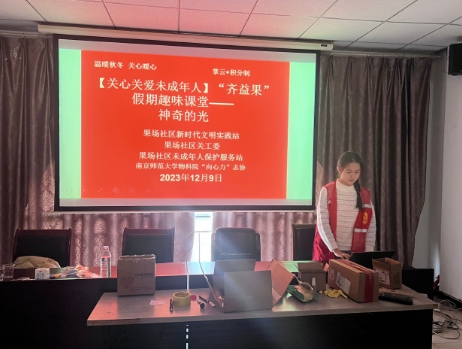 為促進(jìn)科技創(chuàng)新,普及科學(xué)知識,弘揚科學(xué)精神,助力未成年人科學(xué)素質(zhì)的提升,南師大物科院“向心力”志協(xié)在領(lǐng)隊張潔同學(xué)的帶領(lǐng)下來到馬群街道果場社區(qū),與社區(qū)未成年人保護(hù)服務(wù)站、關(guān)工委共同依托社區(qū)新時代文明實踐站科技與科普服務(wù)平臺,借助“齊益果”掌云+積分制工作機制組織社區(qū)未成人及其家庭進(jìn)行“溫暖秋冬 關(guān)心暖心”主題物理科普課堂活動。