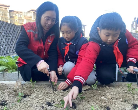 聚焦“一小”,編織“成長搖籃”。在高店社區(qū)新時代文明實踐站,張謇小學(xué)的學(xué)生們跟著黨員志愿者參觀屋頂農(nóng)場,學(xué)習(xí)農(nóng)作物的生長,除草、翻土、掘坑、澆水、放苗、施肥,感受著勞動實踐帶來的快樂。