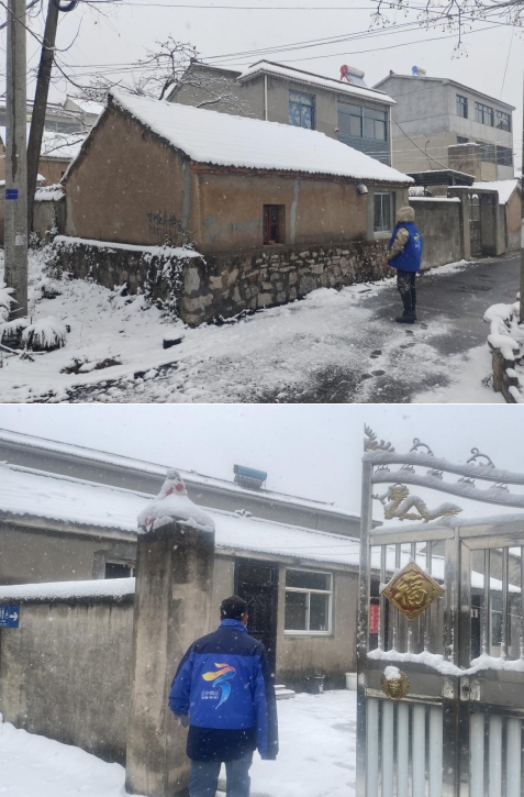 在這場雪中,青龍社區(qū)的網(wǎng)格員們對家有危房的居民進行了上門查看。他們冒著嚴寒,踏著積雪,逐戶走訪,仔細查看房屋的結(jié)構(gòu)和安全狀況。對于存在安全隱患的房屋,他們及時提醒居民采取措施,防止意外發(fā)生。