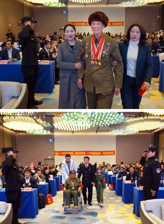 當(dāng)崔志揚(yáng)、芮學(xué)賢、袁友卿、朱萬儲(chǔ)等6位老兵被簇?fù)碇呱现飨_(tái)時(shí),當(dāng)“老兵歸隊(duì)”“敬禮”等一個(gè)個(gè)震撼心靈的聲音響起時(shí),整個(gè)會(huì)議大廳掌聲雷動(dòng),200多名參會(huì)代表紛紛起立,向英雄的老兵行注目禮。12月23日下午,地處革命老區(qū)茅山的句容假日酒店里溫暖如春,句容市關(guān)愛退役軍人協(xié)會(huì)成立慶典現(xiàn)場高潮迭起、氣氛熱烈。