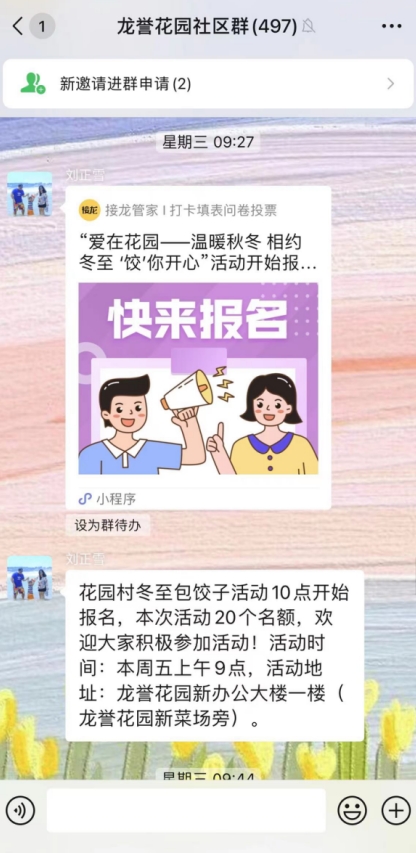 為進(jìn)一步豐富村民業(yè)余文化生活,弘揚(yáng)中華傳統(tǒng)文化,提高村民生活幸福感,讓村民們更好地感受節(jié)日氛圍。南京市棲霞區(qū)龍?zhí)督值阑▓@村委會(huì)利用“掌上云社區(qū)”小程序發(fā)布冬至活動(dòng)招募,線下社區(qū)“掌上云社區(qū)”志愿者開展“溫暖秋冬 相約冬至”主題活動(dòng)。