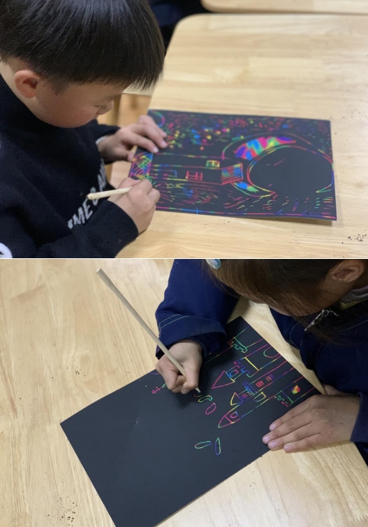 活動現(xiàn)場,孫老師首先詳細(xì)解析了刮畫技巧與創(chuàng)作路徑,激發(fā)了孩子們的好奇心與創(chuàng)作熱情。緊接著,孫老師親身示范,引導(dǎo)孩子們動手實(shí)踐。孩子們聚精會神,聆聽孫老師的悉心指導(dǎo),小心翼翼地操作刮刀。他們充分發(fā)揮想象力和創(chuàng)意,將平淡無奇的刮畫紙點(diǎn)綴得色彩斑斕。經(jīng)過一個(gè)多小時(shí)的共同努力,一幅幅獨(dú)具匠心的創(chuàng)意刮畫作品逐一呈現(xiàn),讓孩子們收獲了滿滿的成就感。