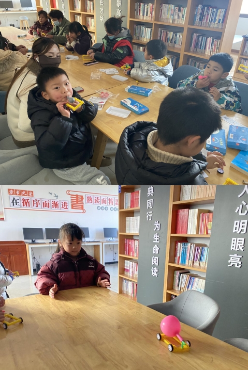 活動(dòng)開(kāi)始前,志愿者老師通過(guò)幾個(gè)互動(dòng)小游戲讓孩子們感受作用力與反作用力,引導(dǎo)孩子們認(rèn)識(shí)反沖力。很快激發(fā)了孩子們的發(fā)散思維,能夠聯(lián)系生活找到很多運(yùn)用反沖力的例子。小朋友們恍然大悟,原來(lái)火箭、煙花等都運(yùn)用這一科學(xué)原理。在制作反沖力小車(chē)的過(guò)程中,孩子們認(rèn)真專注,不太熟練地學(xué)著用皮筋扎緊氣球,吹氣球時(shí)吹得滿臉通紅,可是當(dāng)小車(chē)在氣球放氣的反推下快速走動(dòng)時(shí),孩子們一個(gè)個(gè)高興地跳起來(lái),迫不及待地找?guī)讉€(gè)好朋友去進(jìn)行比賽。在比賽中,小朋友們也得出一個(gè)結(jié)論,原來(lái)氣體量越大,反沖力就越大,小車(chē)也就跑得越快越遠(yuǎn)。在這濃厚的科學(xué)氛圍下,滿足了小朋友們的好奇心,開(kāi)啟了小朋友們的探索之路。