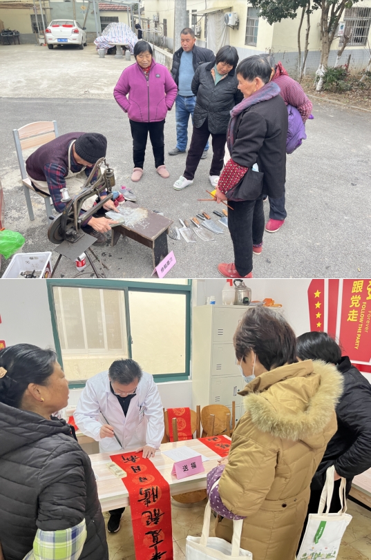 整合服務(wù)資源,服務(wù)供給多樣化。本次活動(dòng)不僅邀請(qǐng)了南京工程學(xué)院門(mén)診部師生資源,為社區(qū)村民提供測(cè)血糖、測(cè)血壓、健康問(wèn)診、寫(xiě)福送春聯(lián)服務(wù),同時(shí)還有本村的志愿者服務(wù)資源——修鞋、理發(fā)、磨刀,讓村民不出社區(qū),也能辦很多事,享受更多的服務(wù)。