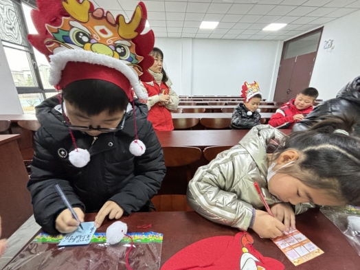 除了閱讀和討論,活動還為孩子們準備了手工制作環(huán)節(jié)。志愿者們發(fā)放了“頭龍帽”制作材料包,引導孩子們親自動手制作頭龍帽。在志愿者的耐心指導下,孩子們發(fā)揮想象力,認真制作著屬于自己的頭龍帽。不一會兒,一個個精美的頭龍帽就完成了。孩子們戴上自己制作的頭龍帽,臉上洋溢著自豪和喜悅。此外,活動還特別設置了寫下新年期待的環(huán)節(jié)。志愿者們邀請孩子們用紙筆寫下自己的新年愿望和期待?;顒幼詈螅厥鍨楹⒆觽儨蕚淞她埬曛黝}公仔盲盒抽取,讓孩子們感受著迎接新年的喜悅和美好。
