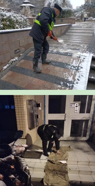 金堯花園轄區(qū)上城風(fēng)景5-11棟掌上云居民交流群里居民在交流,發(fā)現(xiàn)時家門時單元門口的臺階很是濕滑,提醒其他業(yè)主注意安全。就在這同時,掌上云交流群里管理員也觀注到了這一信息。于是,立刻回復(fù)群居民,社區(qū)和物業(yè)已經(jīng)在行動。隨即將工作人員正在陸續(xù)鋪設(shè)樓道口與積雪干道的照片轉(zhuǎn)發(fā)到群里,提醒居民還是要注意安全。就是這樣,在物業(yè)的辛苦付出下,在居民的渴望下,南苑小區(qū)19棟55個單元,工作人員頂著嚴(yán)寒在寒風(fēng)夜色中樓道單元門口的草墊鋪設(shè)完畢。