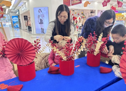 在親子手工制作新年抱抱桶環(huán)節(jié)中,工作人員提前準(zhǔn)備好帶有新年祝福字樣的抱抱桶,家長和小朋友們共同攜手將冬青、金錢草和蕨葉等材料設(shè)計好造型,并添加配飾,讓大家現(xiàn)場感受新年的美好氛圍。