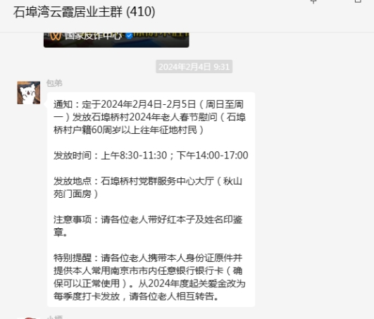 為了讓社區(qū)的老人們度過(guò)一個(gè)溫馨、快樂(lè)的春節(jié),南京市棲霞區(qū)棲霞街道石埠橋村社區(qū)利用掌上云社區(qū)微信群發(fā)布信息,決定于2024年2月4日至5日,為60周歲以上的往年征地村民發(fā)放春節(jié)慰問(wèn)金。