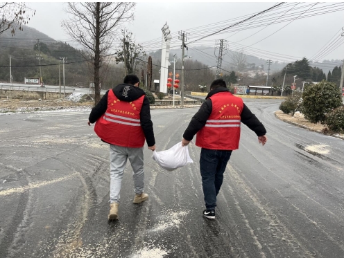在寒風(fēng)凜冽中,身穿紅馬甲衣服的黨員志愿者不畏嚴(yán)寒,對(duì)容易結(jié)冰且安全隱患大的彎道、陡坡路段進(jìn)行了全面的撒鹽工作。他們細(xì)心地將工業(yè)鹽撒在路面上,確保鹽粒能夠迅速融化冰雪,減少路面結(jié)冰的可能性。同時(shí),他們還通過(guò)居民聯(lián)系微信群向轄區(qū)居民宣傳凝凍天氣的注意事項(xiàng),提醒大家在出行時(shí)要特別小心。
