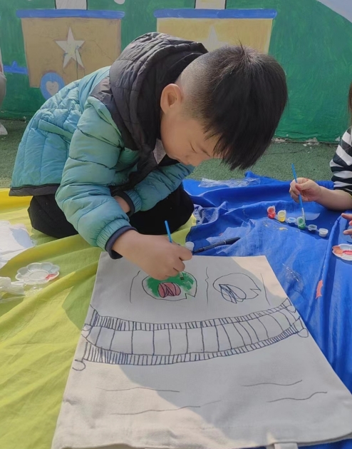 隨后,孩子們將自己眼中的春天畫到了帆布包上。他們或蹲或坐,或低頭沉思或揮筆作畫,每個人都沉浸在自己的創(chuàng)作中。在他們的筆下,春天變得栩栩如生,花朵綻放、綠草如茵、小鳥歡歌,一幅幅充滿生機與活力的春天畫卷展現(xiàn)在大家面前。