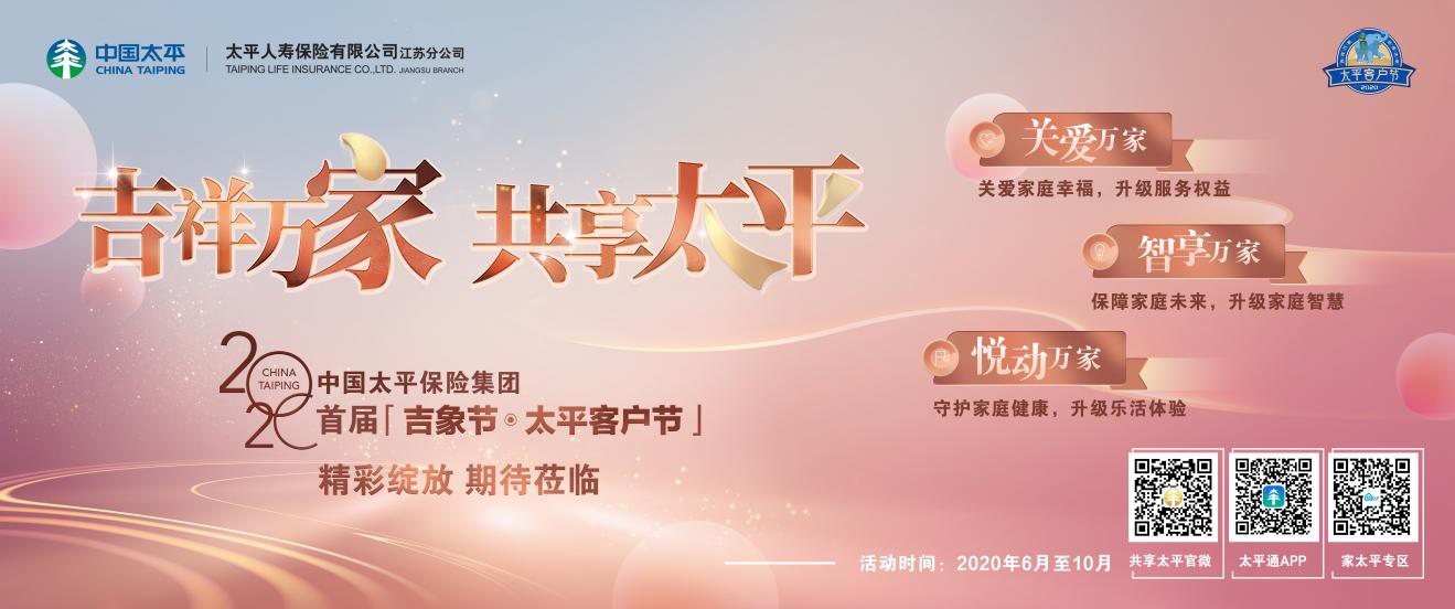 中國(guó)太平首屆“吉象節(jié)-太平客戶節(jié)”,圍繞“吉祥萬(wàn)家,共享太平”主題,特設(shè)“關(guān)愛(ài)萬(wàn)家”、“悅動(dòng)萬(wàn)家”、“智享萬(wàn)家”三大版塊,打造溫情回饋、健康運(yùn)動(dòng)、教育智囊系列活動(dòng),將吉祥如意傳遞到千家萬(wàn)戶,為每一個(gè)家庭帶去歡樂(lè)與幸福。