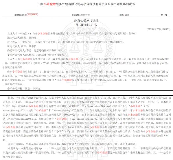 7月7日,北京知識(shí)產(chǎn)權(quán)法院發(fā)布民事判決書,對(duì)山東小米金融服務(wù)外包有限公司、小米科技有限責(zé)任公司之間的糾紛做出二審判決。