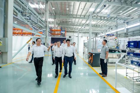 蘇州市副市長吳曉東(前左一)等領(lǐng)導(dǎo)在林琦(右一)的陪同下參觀重塑科技常熟產(chǎn)業(yè)化基地產(chǎn)線