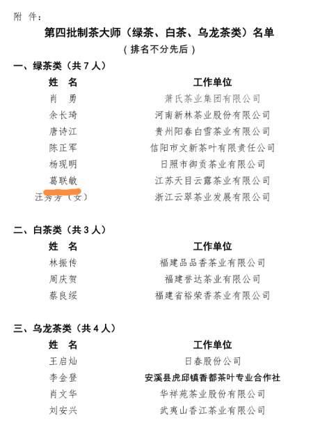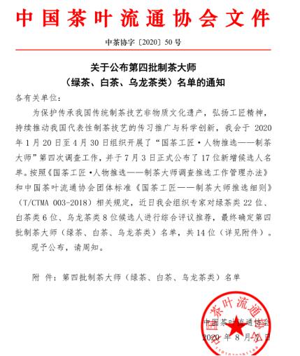 2020年1月20日至4月30日組織開展了第四次調(diào)查工作,并于7月3日正式公布了17位新增候選人名單。按照《國茶工匠·人物推選一一制茶大師調(diào)查推選工作管理辦法》和中國茶葉流通協(xié)會(huì)團(tuán)體標(biāo)準(zhǔn)《國茶工匠--制茶大師推選細(xì)則》(T/CTMA 003-2018)相關(guān)規(guī)定,對(duì)候選人進(jìn)行綜合評(píng)議推薦,最終確定第四批制茶大師(綠茶、白茶、烏龍茶類)名單共14位。江蘇天目雲(yún)露茶業(yè)有限公司董事長葛聯(lián)敏作為本批次的綠茶類制茶大師名列其中,實(shí)屬不易。