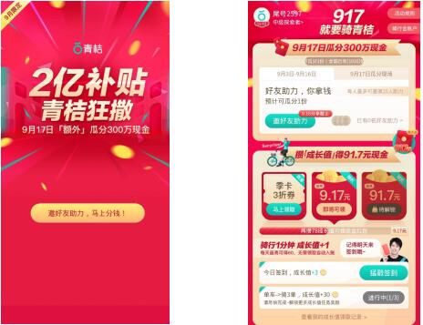 9月3日-9月16日,每人/每天有2次抽獎機會,無需騎行,進入活動頁面自動獲得,可直接抽取。用戶通過抽獎有幾率獲得917元現(xiàn)金、91.7元現(xiàn)金、9.17元現(xiàn)金、騎行折扣券和成長值等約50種隨機獎勵,均為限量,先到先得。同時,用戶可以邀請好友共同助力成長值,在9月17通過騎行,瓜分300萬現(xiàn)金。