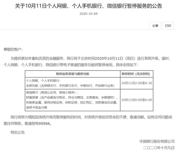 中國銀行:10月11日暫停網(wǎng)銀和手機(jī)銀行服務(wù)
