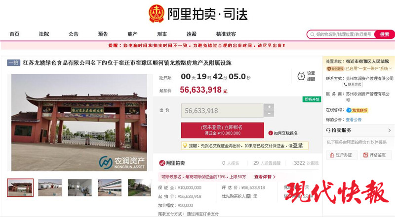 現(xiàn)代快報記者近日了解到,12月1日,江蘇龍嫂綠色食品有限公司(以下簡稱“龍嫂食品公司”)名下位于宿遷市宿豫區(qū)順河鎮(zhèn)龍嫂路的房地產(chǎn)及附屬設(shè)施,將以5663.3918萬元進行打包拍賣。